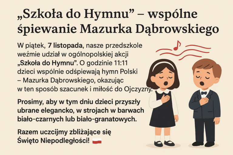 W piątek, 7 listopada, nasze przedszkole weźmie udział w ogólnopolskiej akcji „Szkoła do Hymnu”. O godzinie 11:11 dzieci wspólnie odśpiewają hymn Polski – Mazurka Dąbrowskiego,