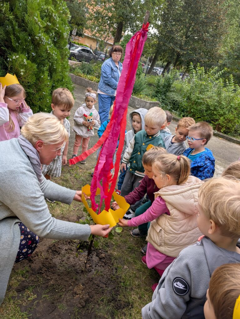 19 września 2025 roku dzieci grup Świerszczy oraz Motylków wraz z Panią Agnieszką zasadziły w ogrodzie przedszkolnym „Królewski krzew” – Świdośliwę Jajowatą – roślinę rosnącą
