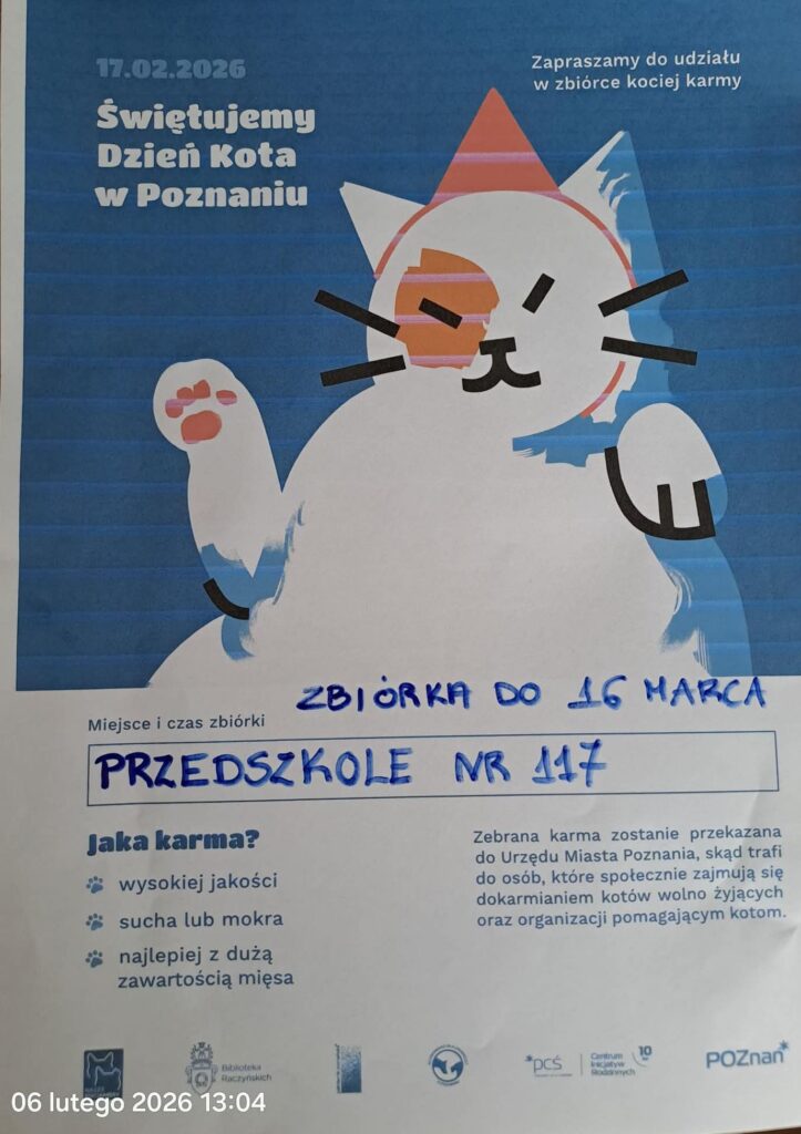 W związku z tym nasze przedszkole włącza się w miejską inicjatywę i organizuje zbiórkę na rzecz kotów wolno żyjących oraz podopiecznych Schroniska dla zwierząt w Poznaniu, fundacji i Kocich Opiekunów Terenowych.